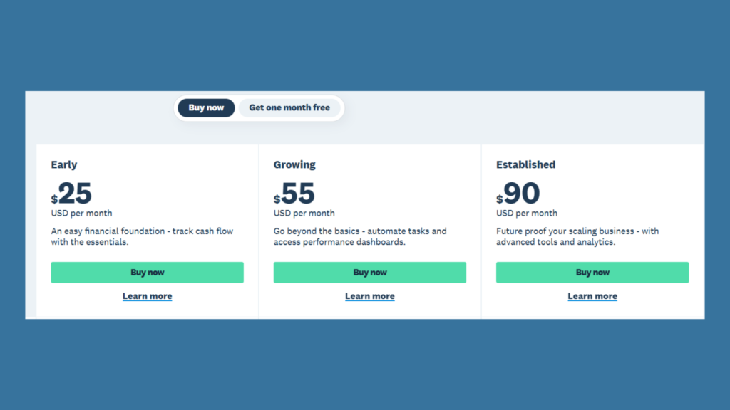 The image below shows a screenshot of the different plan that Xero offers. Each one is tailored to suit different businesses from Early / Startups, to Growing Businesses and Established Businesses.